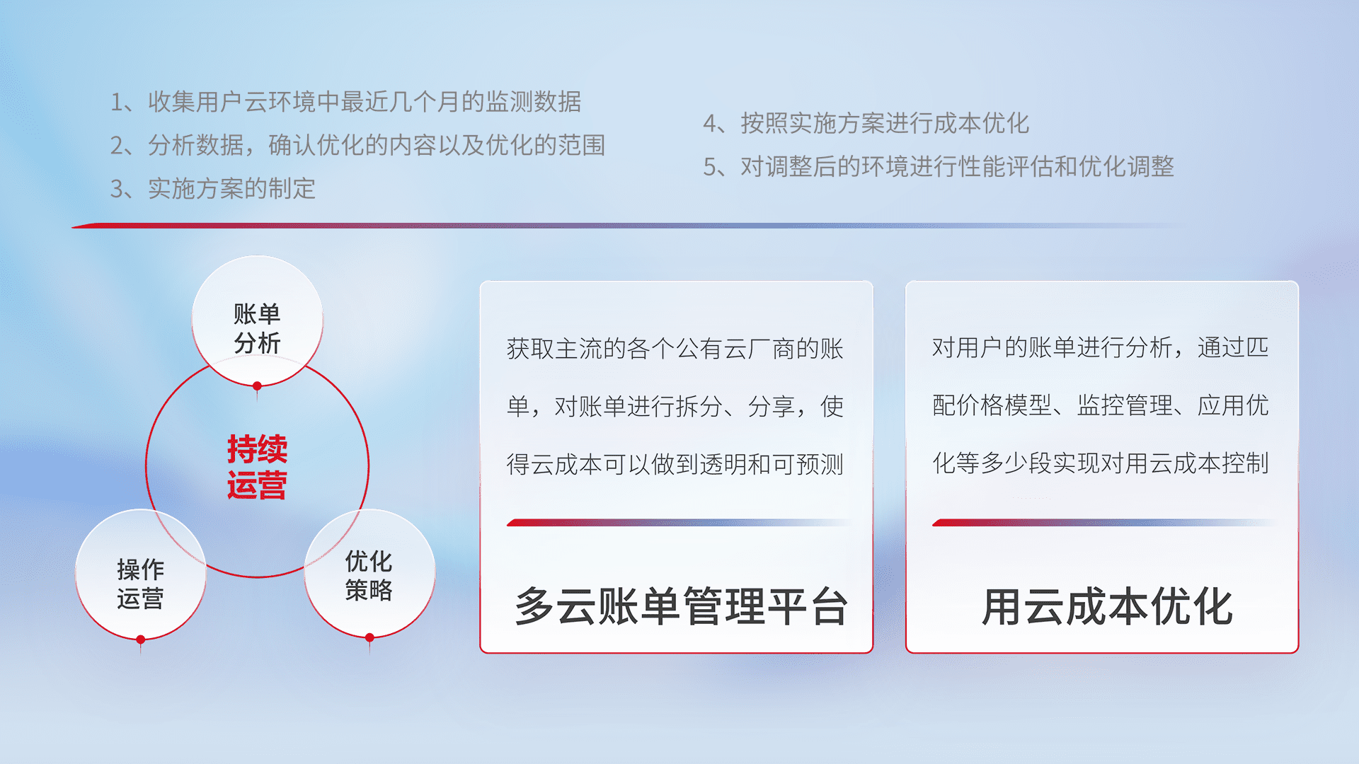 通过多云纳管,,,,以统一的资源数据模型把客户的云资源进行抽象和封装,,,,进而实现对多云资源的统一操作,,,保障云资源管理的可靠性、、、稳定性与可用性。。。量身定制化运维内容,,,,配置、、、、开发运维、、、、补丁管理、、、、备份、、监控、、、、认证和访问管理、、、、审计和日常巡检等,,,保障在用云过程中的可靠度,,,稳定度以及高可用率。。